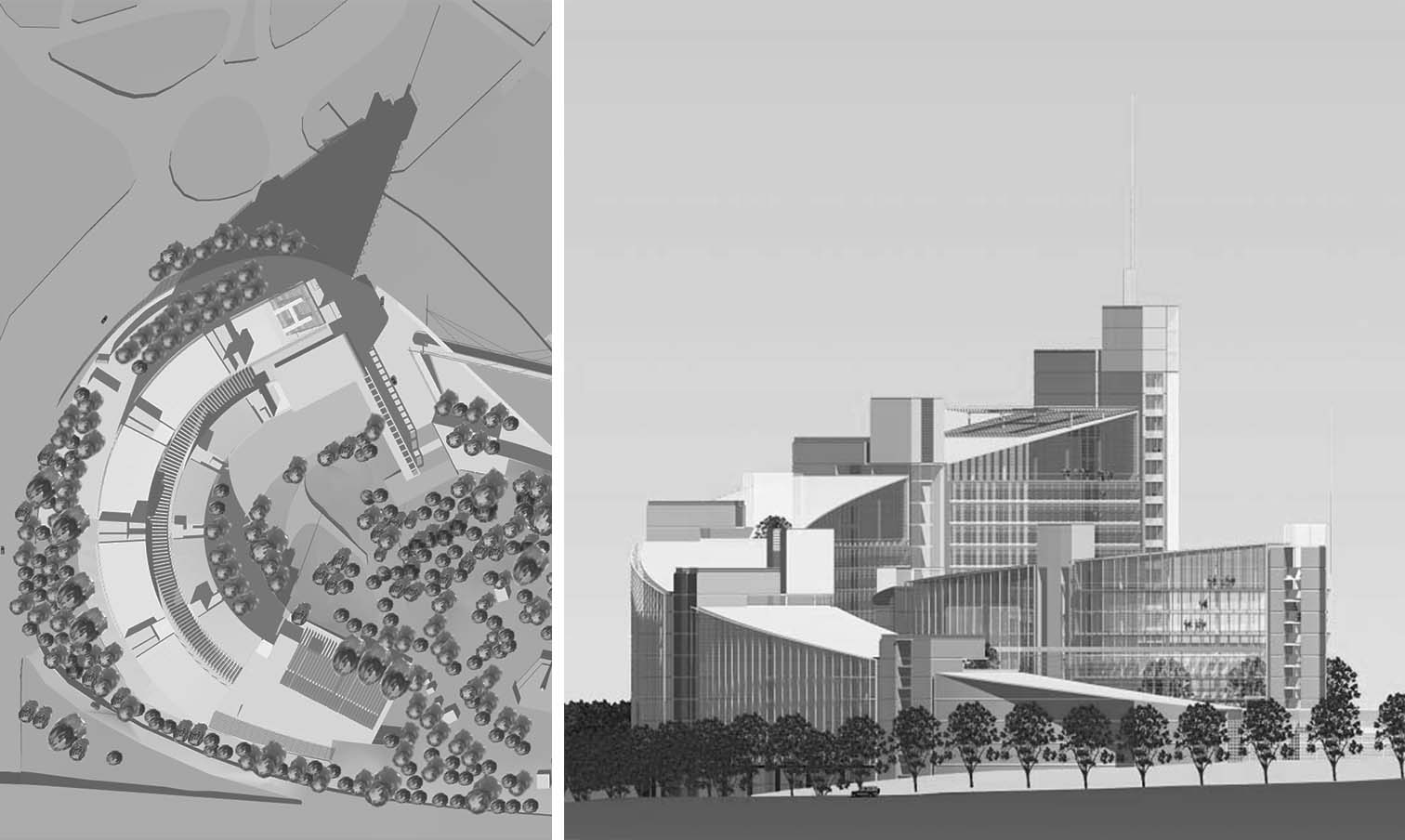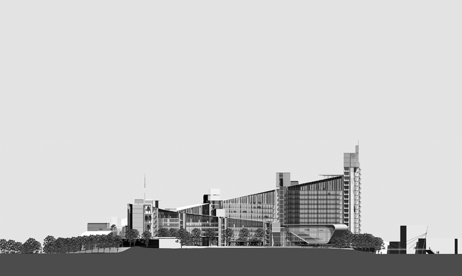 GMW' s prize winning competition entry recognises the opportunity to design the large area of space required as a cluster of building blocks, providing an efficient and attractive working environment which is sensitively integrated with its surroundings. Two parallel rows of buildings are proposed, each crescent shaped on plan and containing a "covered street" between them. The internal 'street', accessible from the main street entrance and the car park below, unifies the whole complex and provides entrances to separate departmental offices. The sloping roof profiles create an interesting dynamic building form offering variable silhouettes from different directions.