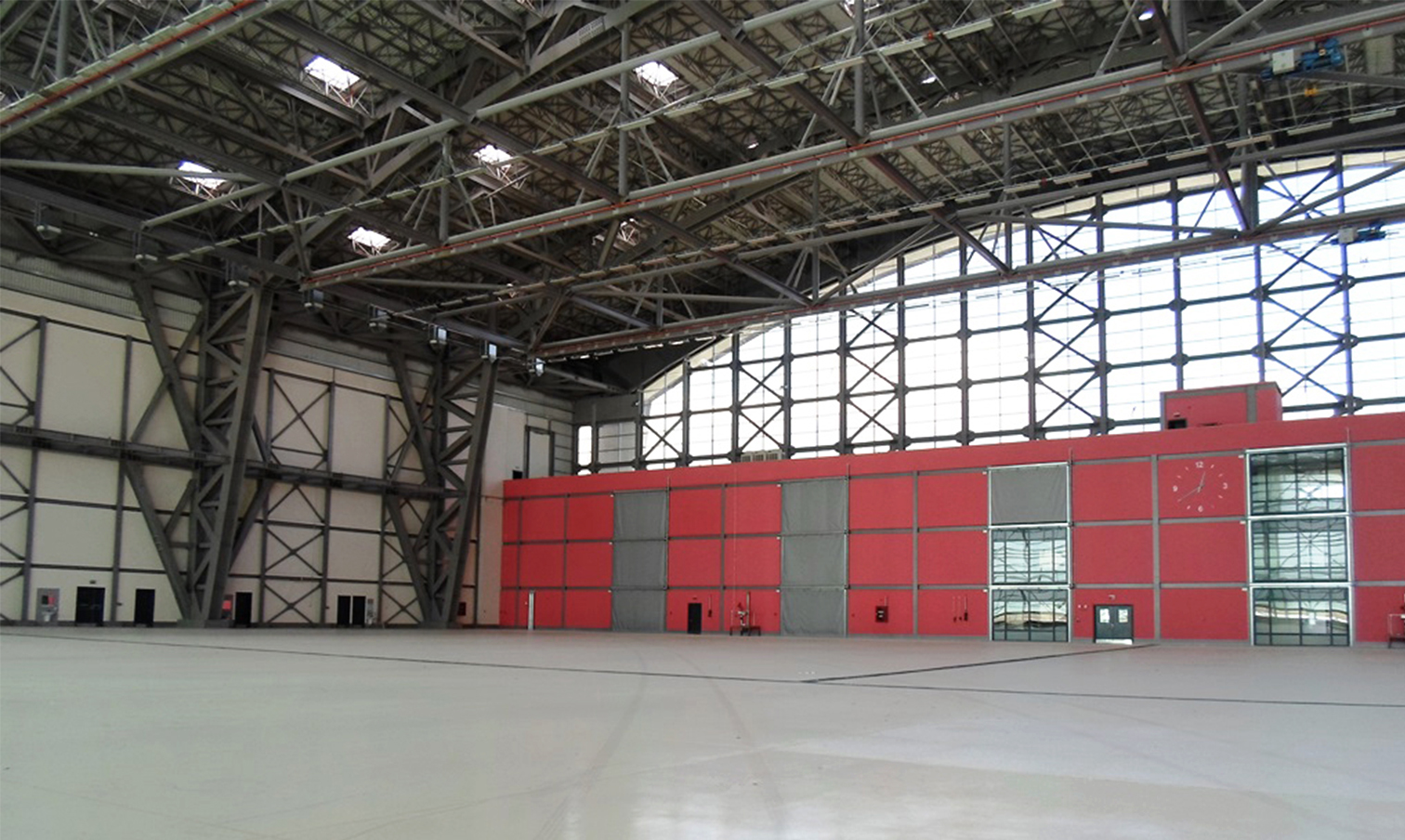 The new aircraft and helicopter hangar will have the capacity to simultaneously undertake first grade maintenance to 5 aircraft and 3 helicopters. With an internal column-free span of 100m, the steel structure is made up of four 10,000sqm. modules. Externally the structural columns and inclined walls, which house the technical service spaces, are clad in natural stone.The long elevation facing the approach road is clad in opaque and transparent glass panels in aluminium framing. The large sliding doors on the airside elevation are composed of translucent panels to allow maximum daylight inside.