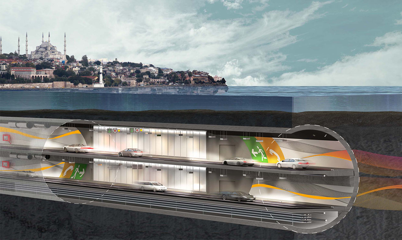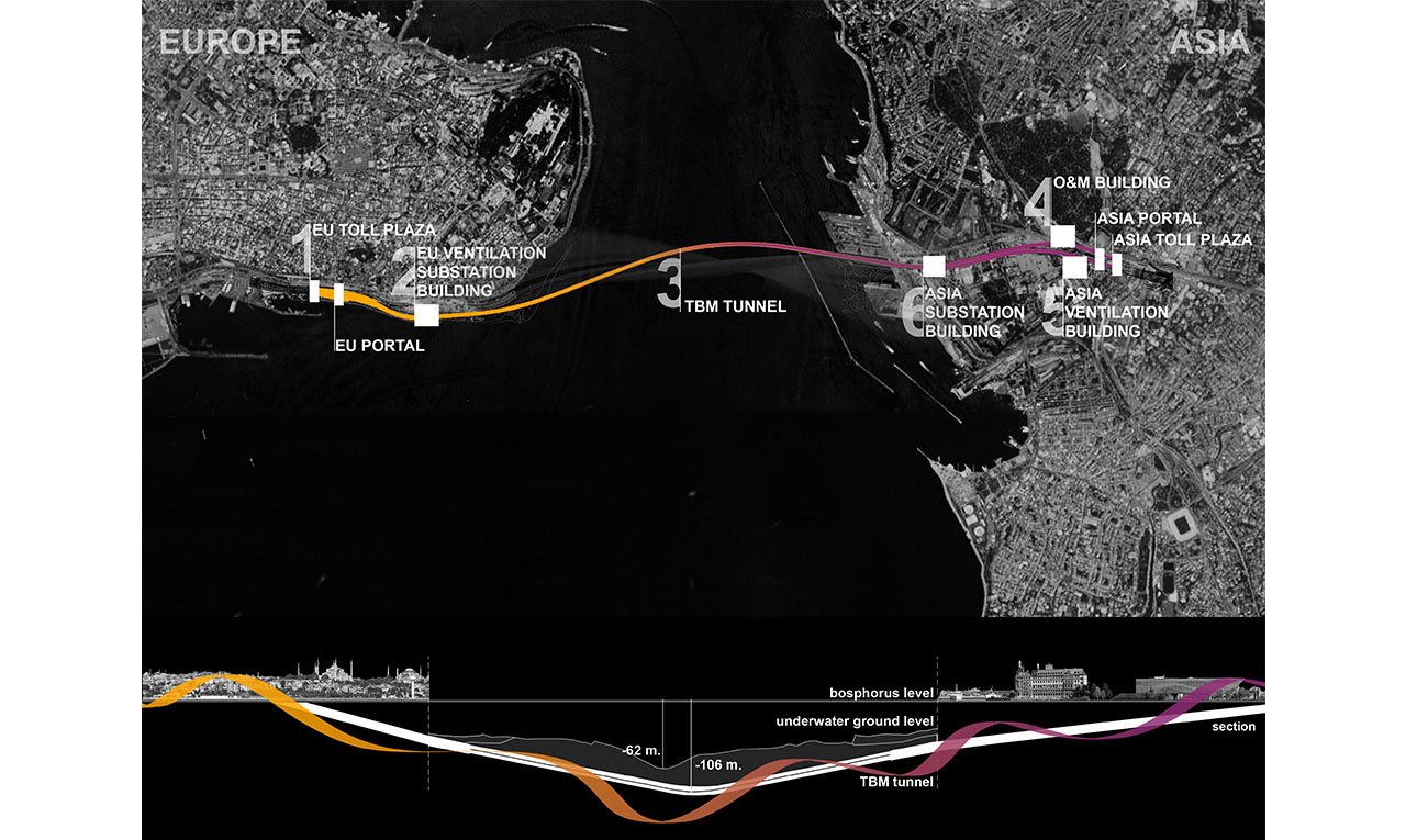 The 1.28 Billion USD Eurasia road tunnel connecting the continents of Europe and Asia is one of the world’s largest infrastructure projects. The 5.4km long two-deck tunnel, 3.4 km of which is bored at a rate of 8-10 meters a day well below the sea bed, will connect the two sides of Istanbul’s Bosphorus. It is a complex of new roads, tunnels and infrastructure works covering 14.6km overall distance. A 13.7m diameter twin deck tunnel is bored utilising a Tunnel Boring Machine engineered specially for this project from Asia to Europe.